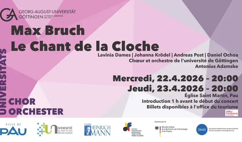 La Universitätsmusik Göttingen est l’invitée de la ville de Pau dans le cadre d’un projet de concert franco-allemand les 22 et 23 avril à 20h, à l'église Saint-Martin. Les choristes et musiciens interpréteront le Chant de la cloche de Max Bruch.