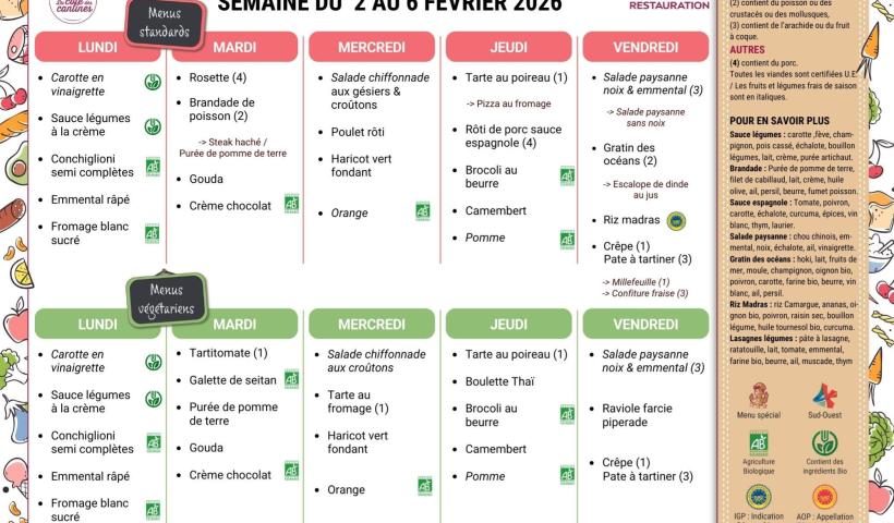 Menus du 26 au 30 janvier