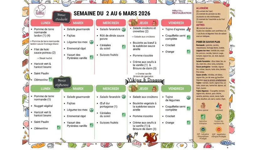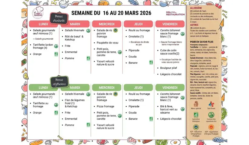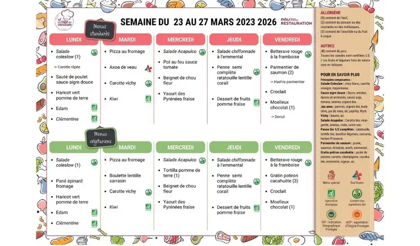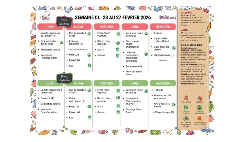 Les menus servis dans les cantines scolaires de Pau, des écoles de l'Agglomération et des centres de loisirs sont préparés par la Cuisine Communautaire avec pour préoccupation constante de veiller à leur variété et leurs qualités nutritionnelle et sanitaire.