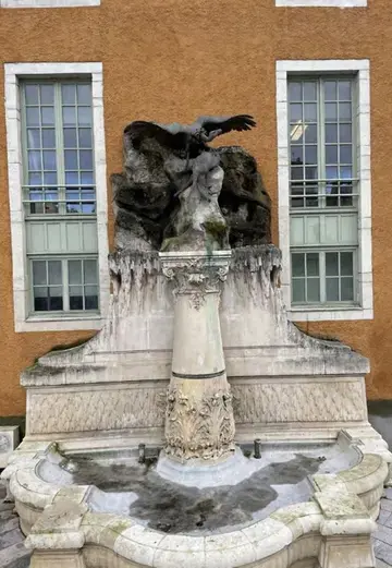 La commanditaire et donatrice, épouse et veuve du docteur, a souhaité la mise en avant de l’’importance de la thématique de l’eau, élément essentiel à la vie et au bien-être. Cette démarche est une façon intime et symbolique de perpétuer le souvenir de son mari qui œuvra pour la santé publique et l’épidémie de choléra. Le thème retenu souligne aussi celui de la mort représentée par l'isard dévoré par le vautour. Le bestiaire volontairement retenu, la mise en scène et la composition se veut aussi un parallèle symbolique du lien étroit de Pau à la nature pyrénéenne. Dédier un aménagement d'agrément et d'utilité urbaine pour un homme qui participa activement à la vie de sa ville a également tout son sens dans cette donation. Au travers de cette fontaine, on peut y voir aussi l'un des accomplissements ultimes des politiques des villes qui prend forme durant la seconde moitié du 19ème siècle en France avec l'embellissement des espaces publics par la création et l'aménagement de parcs et jardins et la démocratisation de l’accès à l'eau en parallèle du raccordement progressif de la population.