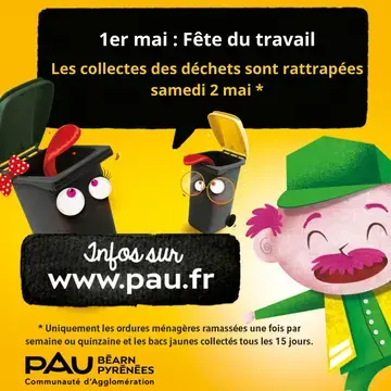 - Pour le jeudi 14 mai, la collecte est reportée le samedi 16 mai sur les communes de Aussevielle, Beyrie-en-Béarn, Bougarber, Uzein, Gan, Gelos, Bosdarros, Mazères-Lezons, Uzos, Rontignon, les coteaux de Jurançon et Pau.