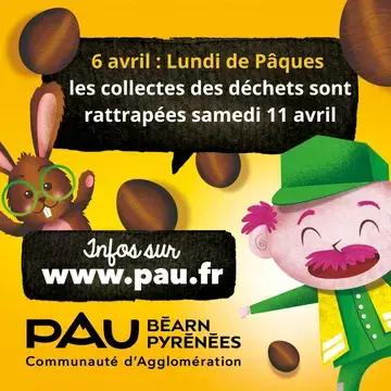 Les collectes des déchets du lundi de Pâques, le 6 avril, sont reportées au samedi 11 avril, à Arbus, Artiguelouve, Bosdarros, Gan, Gelos et Jurançon.