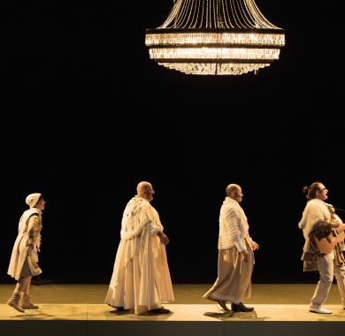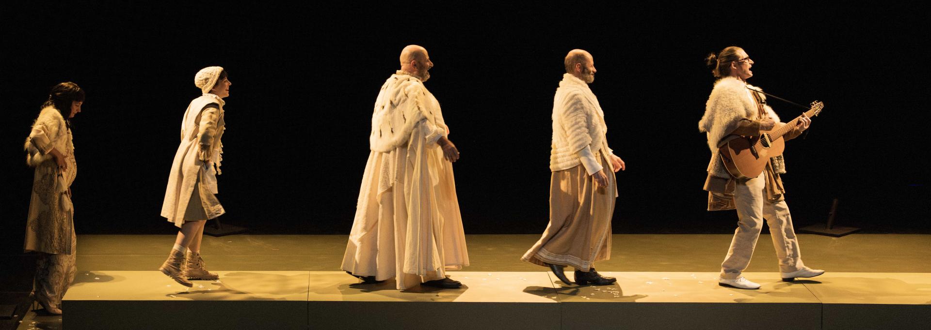De William Shakespeare / Conception et mise en scène Sandrine Anglade / Traduction et dramaturgie Clément Camar-Mercier / Direction musicale Nikola Takov et PierreEmmanuel Roubet / Avec Héloïse Cholley (Mamilius et Perdita, chant), Florent Dorin (Camillo, Paulina, l’ours, chant), Damien Houssier (Léonte et le clown, chant), Laurent Montel (Polixène, un greffier, chant), Sarah-Jane Sauvegrain (Hermione et Florizel, chant), Pierre-Emmanuel Roubet (Autolycus, chant, guitare, accordéon et percussions), Rony Wolff (Antigonus et un vieux berger, chant) / Scénographie et lumières Caty Olive / Costumes Magali Perrin-Toinin / Accessoires Sylvie Martin-Hyszka / Assistante à la mise en scène Héloïse Cholley / Régie générale et lumières Ugo Coppin / Régie plateau Rémi Remongin.