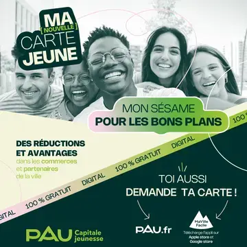 La Ville de Pau lance sa nouvelle Carte Jeune à destination des 13 - 25 ans. Gratuite et accessible, cette carte s’adresse aux jeunes qui résident, sont scolarisés ou travaillent à Pau. Elle est dématérialisée et 100% gratuite.