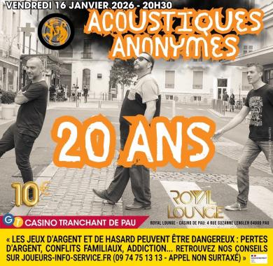 Le groupe emblématique « Les Acoustiques Anonymes » sera sur la scène du Royal Lounge, pour fêter ses 20 ans de musique et offrions un concert exceptionnel, avec des surprises et l’enregistrement de leur prestation en live.