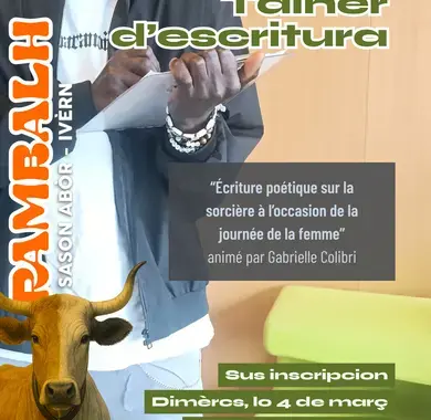 A l'occasion deu 8 de març, dia internacionau deus drets de las hemnas, Gabrielle Colibri, artista de slam, qu'animarà un talhèr d'escritura poetica suu tèma de la broisha dimèrcs, lo 4 de març de 14h30 a 16h30.
