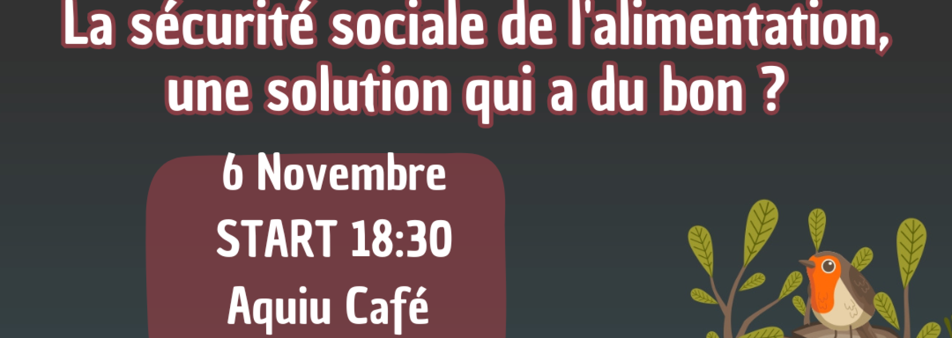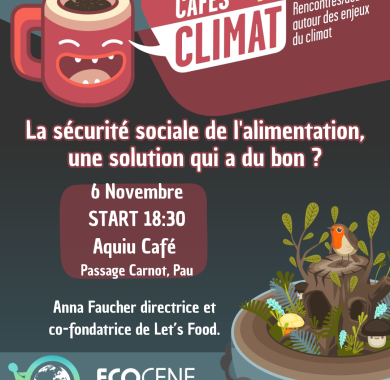 Café Climat 06 novembre 2025 Pau Partager: Partager sur Facebook Partager sur Twitter Partager sur LinkedIn Partager par mail Print Add to Agenda Café Climat 06 novembre 2025 La sécurité sociale de l'alimentation, une solution qui a du bon ? Infos pratiques Adresse: Aquiu café, Passage Carnot, rue Carnot à Pau. Téléphone: 05 53 32 12 36 Adresse email: info@ecocene.fr Lien: https://www.instagram.com/ecocene_pau/?hl=fr Tarif: Gratuit Autres événements dans la même thématique Prev Next 29 octobre 2025 31 octobre 2025 A la une Pelote : l'Europe contre les Amériques Sports Première compétition intercontinentale entre les meilleurs Européens et les meilleurs joueurs venus des Amériques, du Nord et du Sud. COMPLEXE DE PELOTE JAÏ-ALAÏ 30 octobre 2025 01 novembre 2025 A la une 36e festival Image Montagne Festival nature Sports 3 jours de belles images de montagne, d'aventures humaines, de rencontres et de convivialité. ESPACE JAMES CHAMBAUD 31 octobre 2025 A la une Aqu'Halloween au Stade Nautique Sports Pour Halloween, venez participer à un cours d'aquagym spécialement ensorcelé, dans une ambiance festive et frissonnante ! 08 novembre 2025 A la une Visite : Le jardin de Kofu, le Japon à Pau Culture et Patrimoine Venez assisiter à la visite guidée "Le jardin de Kofu, le Japon à Pau" le samedi 8 novembre à 11h. Proposer un événement Voir tous les événements