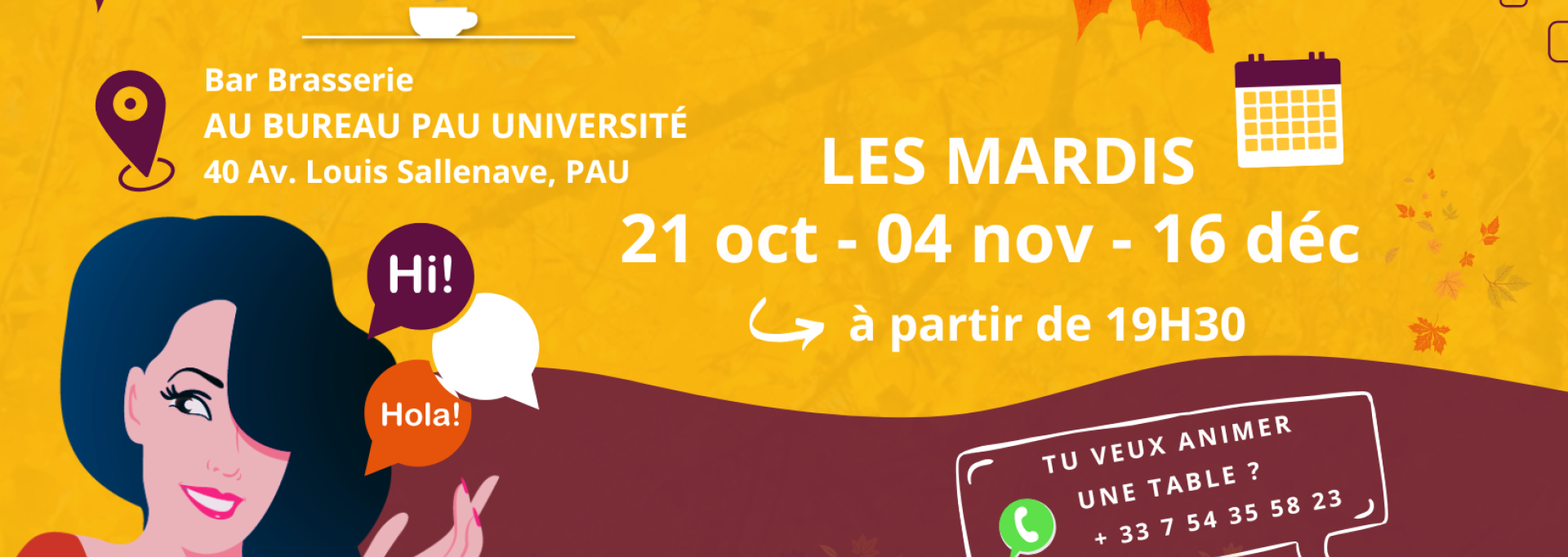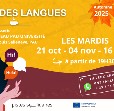 Les Cafés des langues, organisés par Pistes Solidaires – Europe Direct Pau Pays de l’Adour en partenariat avec le bar Au Bureau Pau Université, sont faits pour vous !