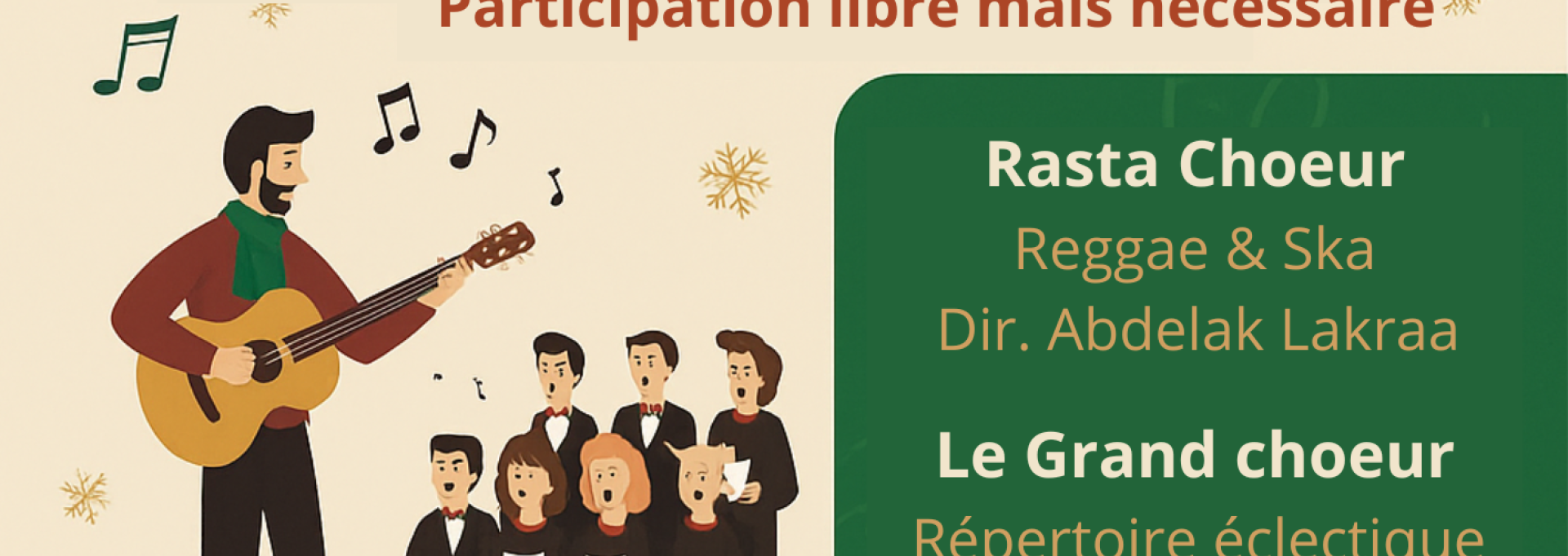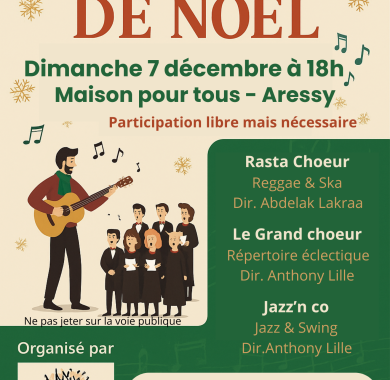 Concert de Noël avec 3 groupes vocaux aux répertoires chaleureux et festifs : Rastachœur, dirigé par Abdelak Lakraa / Le grand Chœur et Jazz&Co, dirigés par Anthony Lille.