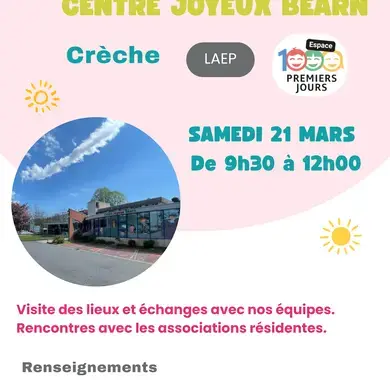 Que vous soyez futurs parents, jeunes parents, le centre Joyeux Béarn vous accueille samedi 21 mars de 9h30 à 12h pour découvrir la crèche.