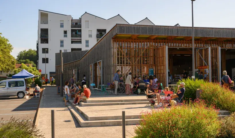 - Halle en bois accueillant le marché bio,