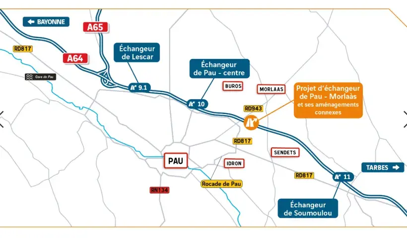 Le projet consiste à créer, entre les sorties n°10 à Pau et n°11 à Soumoulou, un nouvel accès sur l’A64 pour permettre les échanges en provenance et en direction de Bayonne et Tarbes. Il favorisera l’accès à un secteur qui accueille d’importantes zones d’activités en développement avec des besoins d’accessibilité qui se renforcent.