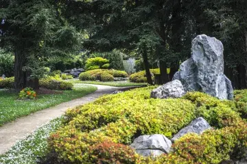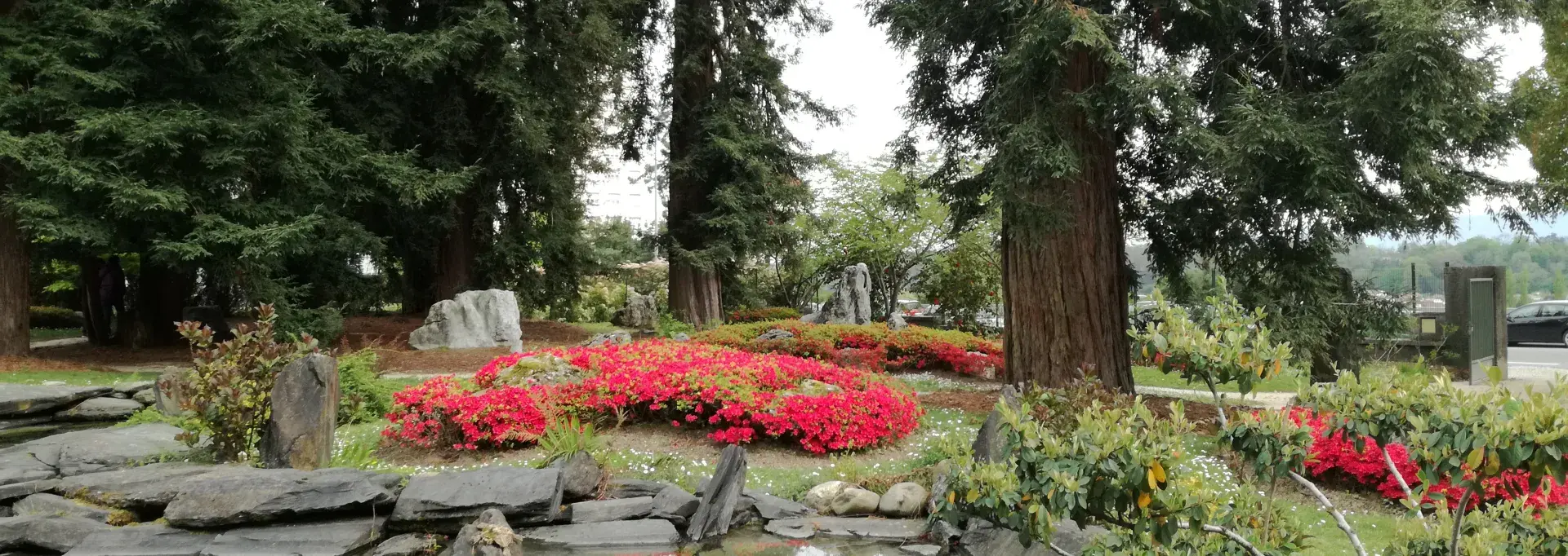 Plantes à admirer : hêtres, cyprès, épicéas taillés en bonsaï, érables et cerisiers du japon, azalées, camélias, séquoias sempervirens.
