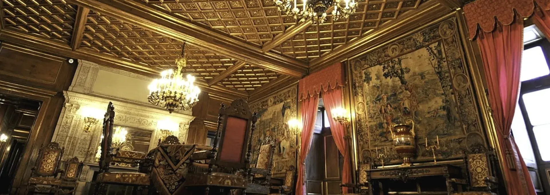 La salle à manger surprend toujours les visiteurs par sa grande table pouvant recevoir 100 couverts tandis que de superbes œuvres d'art tapissent les murs de grands salons aux couleurs vives.