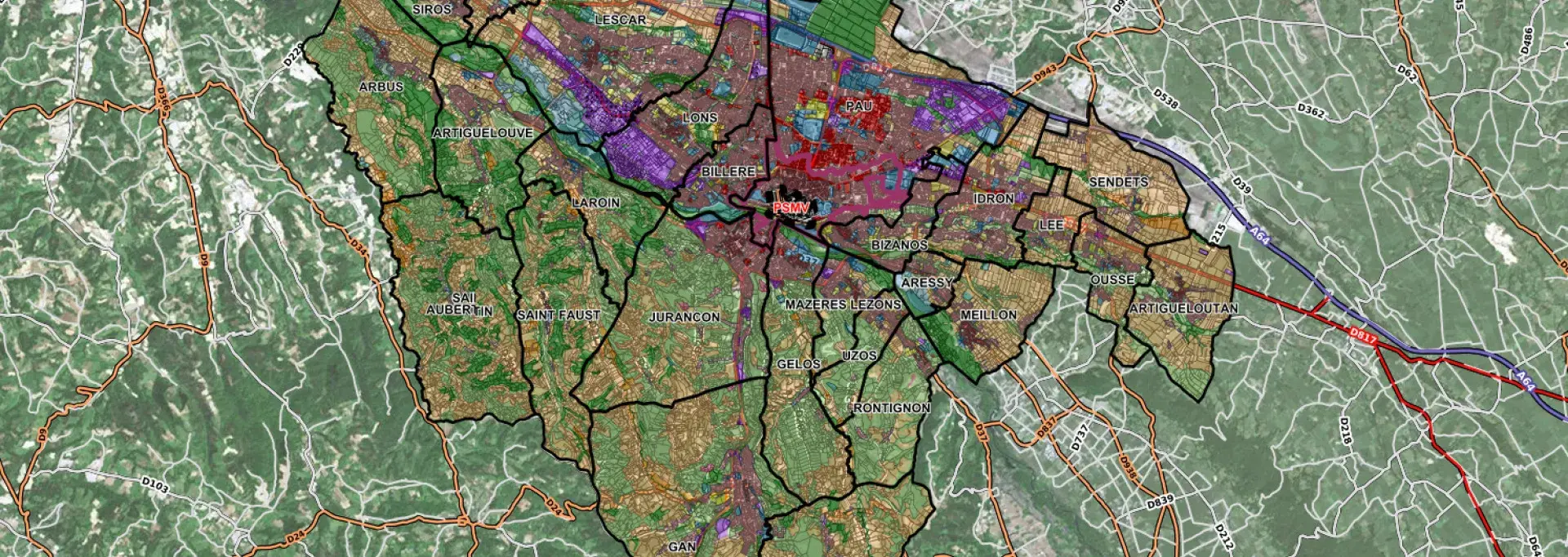 Ce portail cartographique vous permet de visualiser facilement les règles du PLUI (Plan Local d'Urbanisme intercommunal) et du PSMV (Plan de Sauvegarde et de Mise en valeur du centre-ville de Pau) qui s'appliquent à votre terrain : trouvez votre parcelle, la réglementation et éditez la note d'information récapitulative.