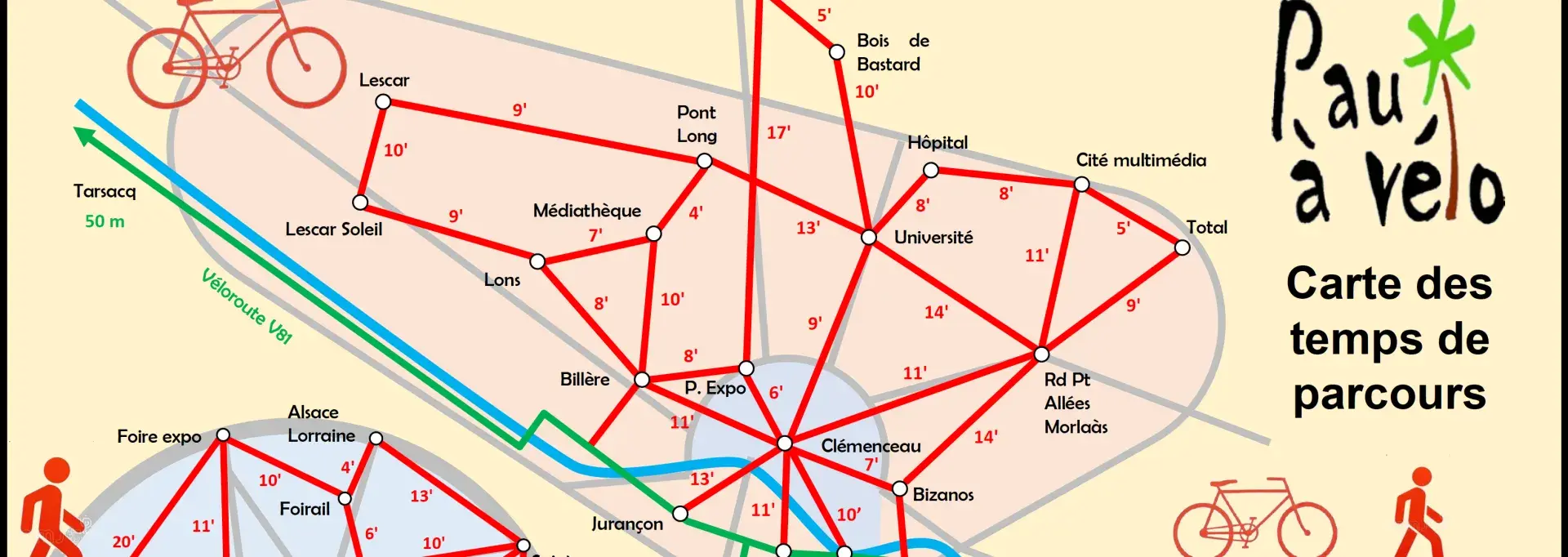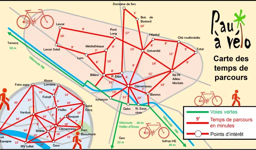 L'association Pau à Vélo a ainsi tracé sur la carte ci-dessus quelques exemples de liaisons qui peuvent être effectuées en un minimum de temps à pied ou à vélo et doivent nous inciter à revoir nos modes de déplacements au profit des mobilités douces.
