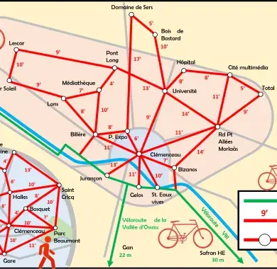 Ce "metrominuto" à la sauce paloise peut vous aider à mieux estimer les temps de parcours à pied ou à vélo entre 2 points de l'agglo "intra-rocade".